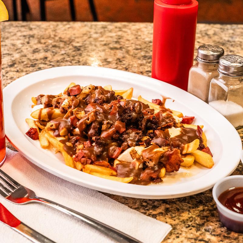 Small $7.58 | Large $10.98 • This fan favorite takes our classic poutine to the next level by adding bacon, smoked sausage, and grilled onions. A local favorite!