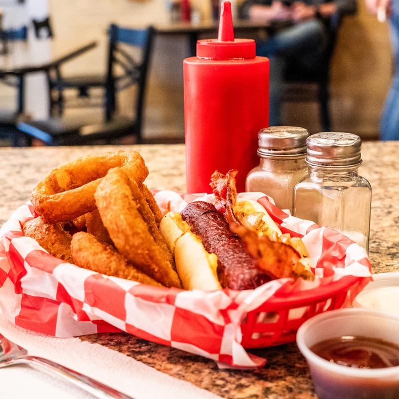 Smoked sausage, bacon, onions, mayo.