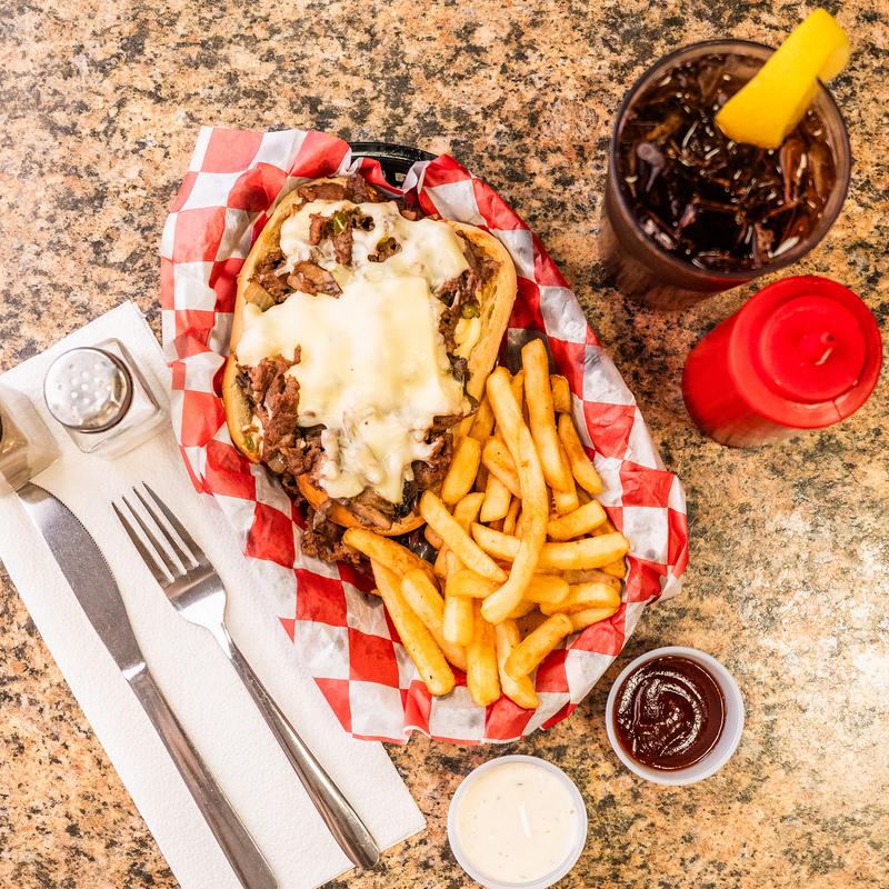 Chopped beef sirloin steak or chicken, onions, mushrooms, peppers, white American cheese, Dukes mayo.